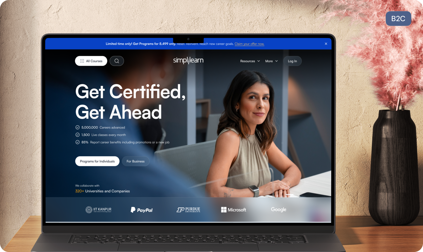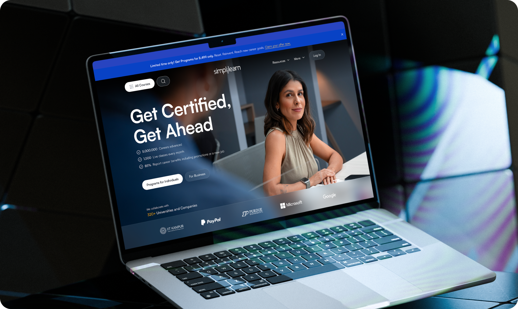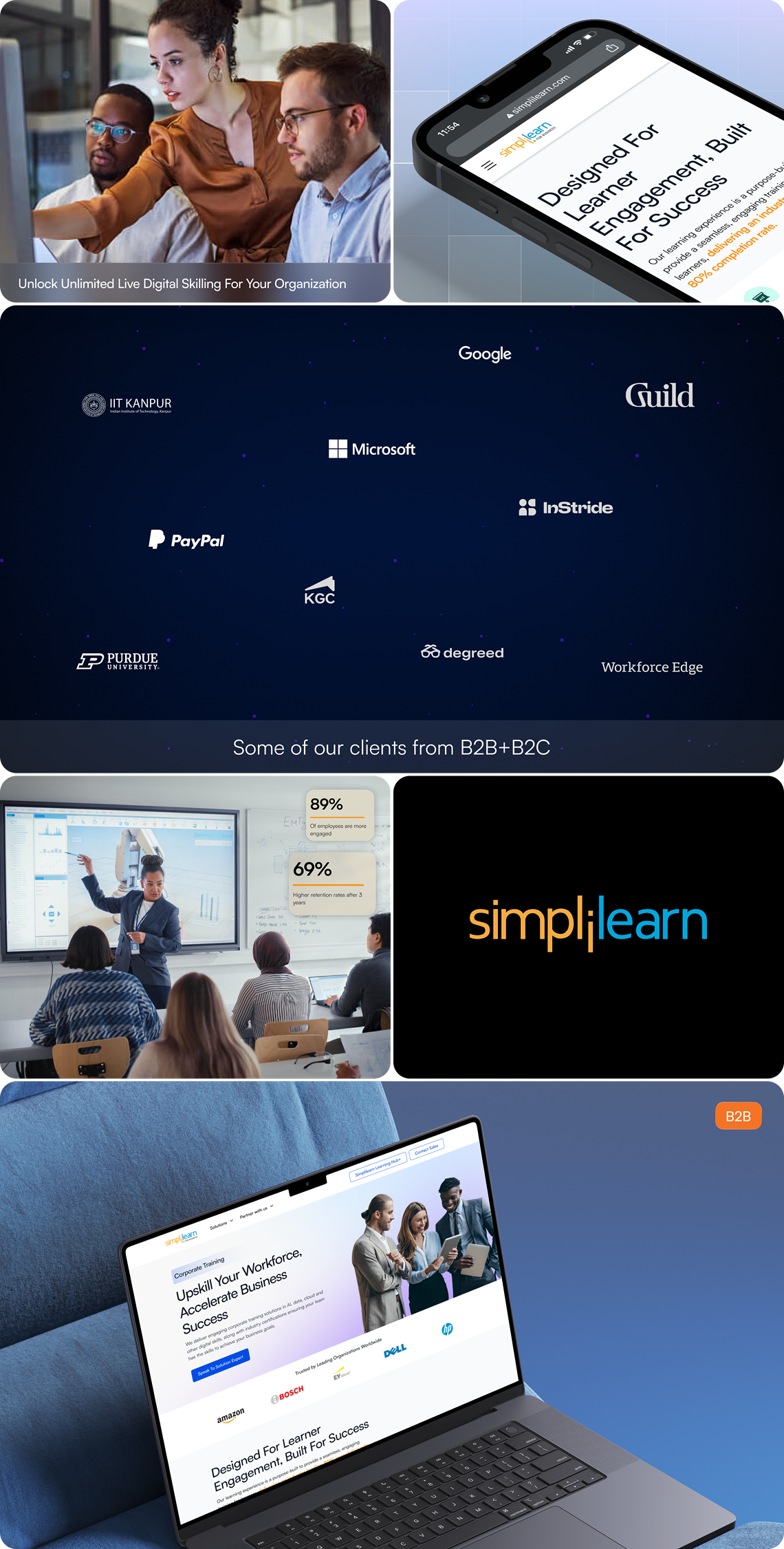 We architected the entire product ecosystem, including the B2C website, Simplilearn Learning Hub+, Simplilearn for Business (B2B), course landing pages, mobile learning experiences, and a scalable design system that supports continuous growth, global audiences, and multi-industry certifications.